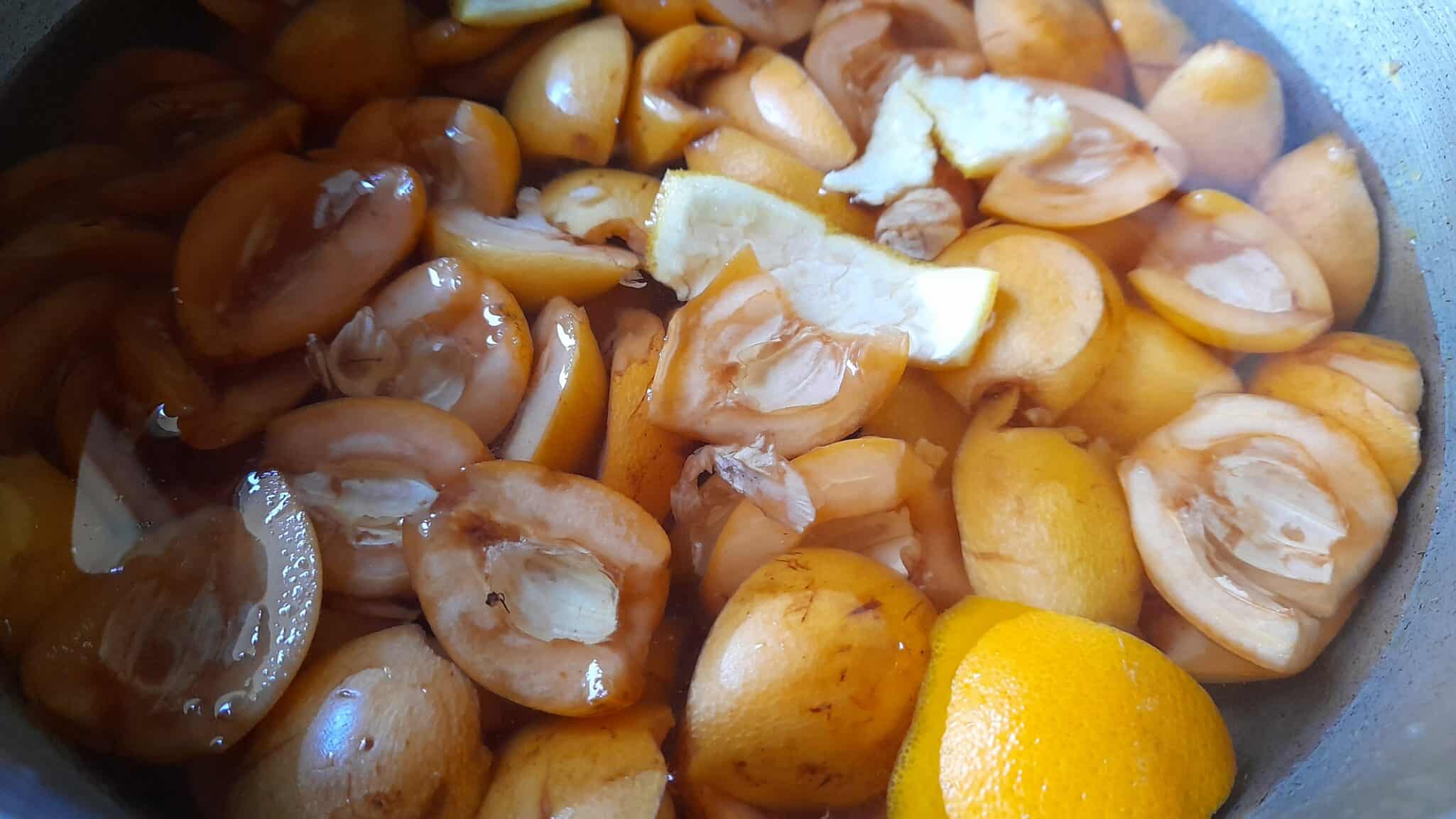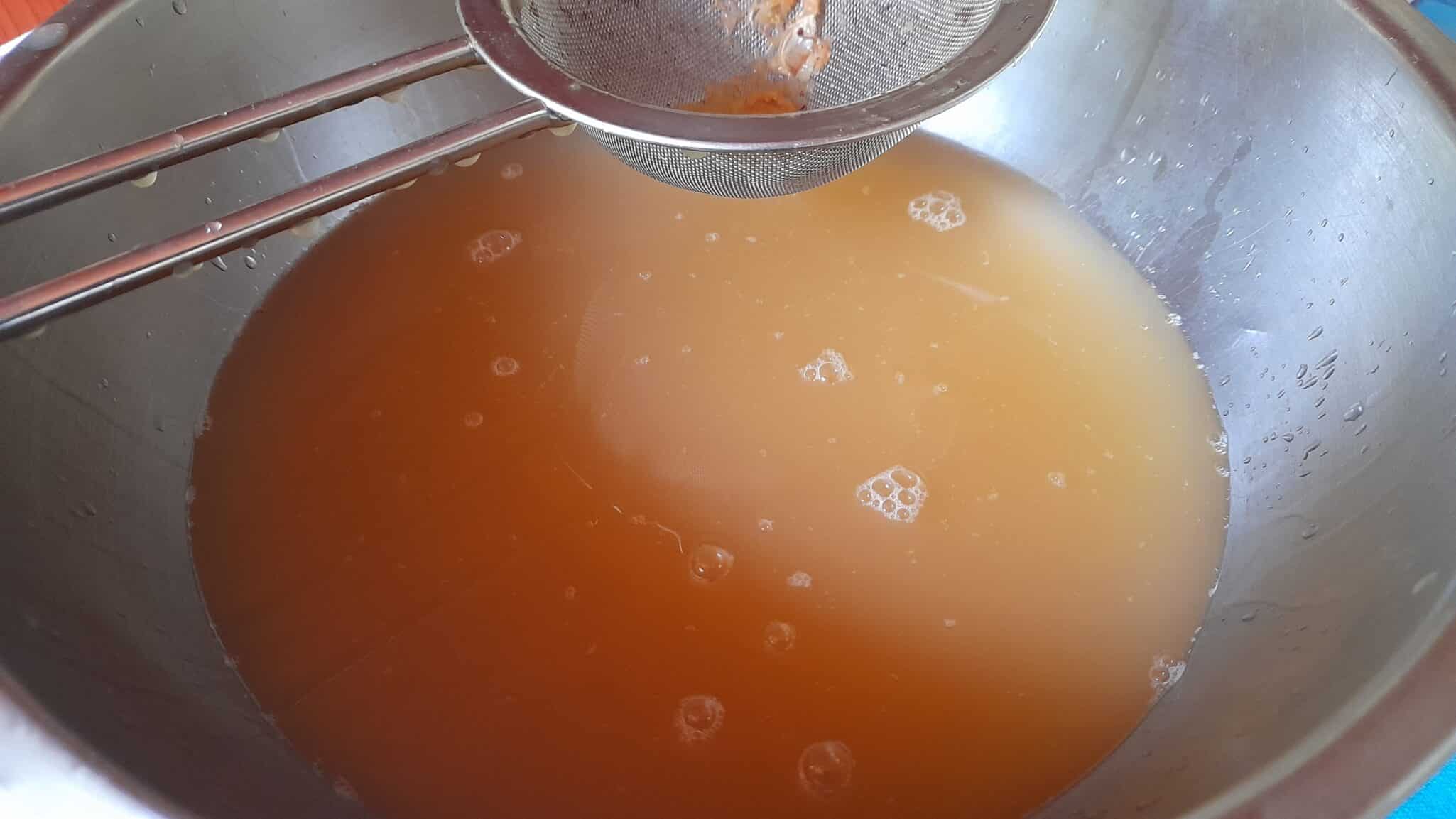 Récupérez l'eau de cuisson et pressez les fruits pour récupérer le reste de jus.